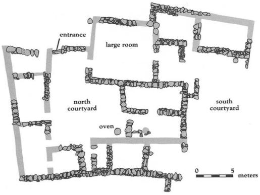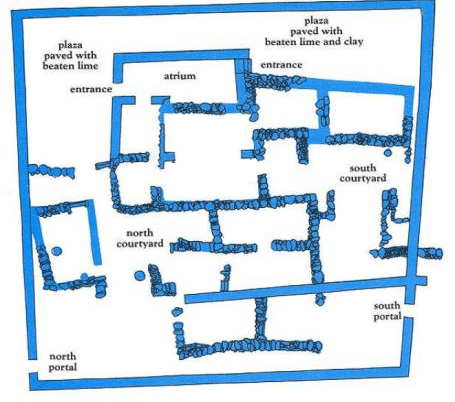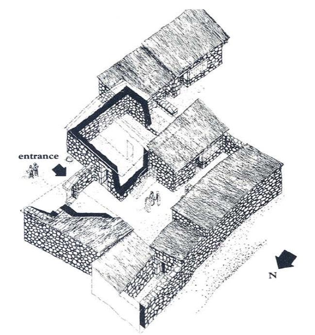 Here’s a diagram of the interior of Peter’s house. It was comprised of rooms and courtyards, with open and closed spaces. It occupied a fairly large space, roughly 75 feet by 75 feet.