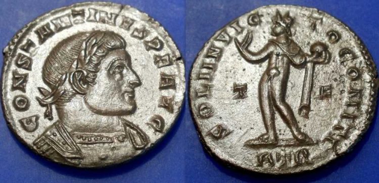 History of the Christian Church, Philip Schaff: At first Constantine, like his father, in the spirit of the Neo-Platonic syncretism of dying heathendom, reverenced all the gods as mysterious powers; especially Apollo, the god of the sun, to whom in the year 308 he presented munificent gifts. Nay, so late as the year 321 he enjoined regular consultation of the soothsayers in public misfortunes, according to ancient heathen usage; even later, he placed his new residence, Byzantium, under the protection of the God of the Martyrs and the heathen goddess of Fortune; and down to the end of his life he retained the title and the dignity of a Pontifex Maximus, or high-priest of the heathen hierarchy. His coins bore on the one side the letters of the name of Christ, on the other the figure of the Sun-god, and the inscription “Sol invictus.” Of course there inconsistencies may be referred also to policy and accommodation to the toleration edict of 313. Nor is it difficult to adduce parallels of persons who, in passing from Judaism to Christianity, or from Romanism to Protestantism, have so wavered between their old and their new position that they might be claimed by both. With his every victory, over his pagan rivals, Galerius, Maxentius, and Licinius, his personal leaning to Christianity and his confidence in the magic power of the sign of the cross increased; yet he did not formally renounce heathenism, and did not receive baptism until, in 337, he was laid upon the bed of death.